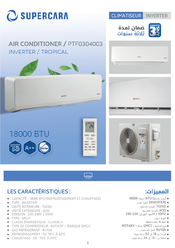 - Climatiseur Super Care PTF0304003 – Inverter Tropical 18000 BTUOffrez-vous un confort optimal avec le climatiseur Super Care PTF0304003, conçu pour fonctionner efficacement dans des conditions tropicales. Grâce à sa technologie Inverter, il assure un refroidissement et un chauffage performants tout en optimisant la consommation énergétique.