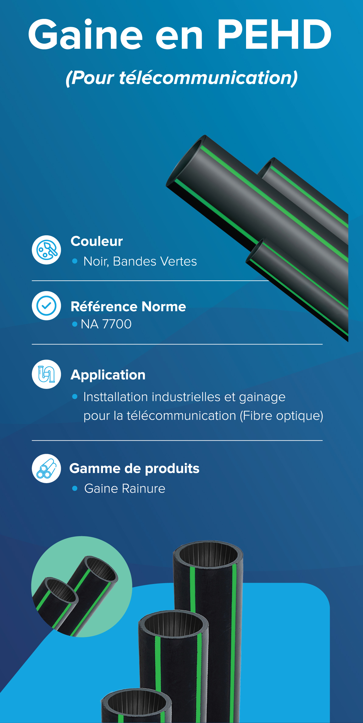 Protection des câbles de télécommunication, notamment ceux utilisés pour la fibre optique. ✅ Résistance aux conditions environnementales : Adapté aux installations souterraines ou aériennes. ✅ Facilité de pose grâce à sa conception rainurée, qui améliore la maniabilité. ✅ Durabilité : Longue durée de vie, même en conditions extrêmes.