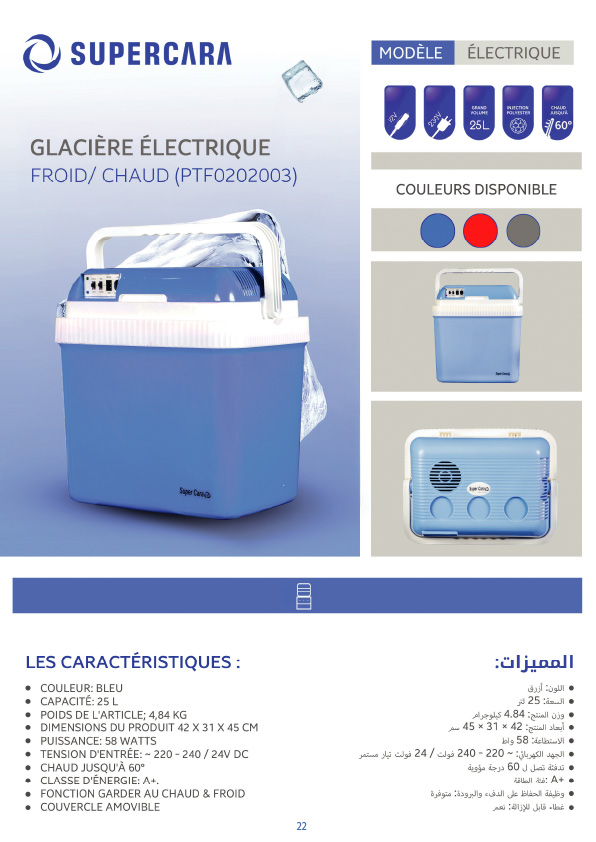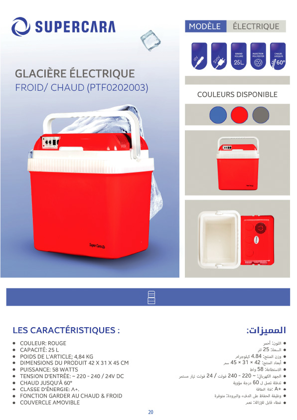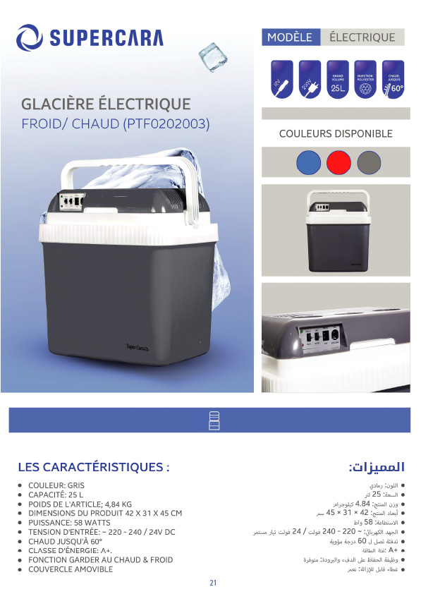 Profitez d’une solution polyvalente avec la SUPERCARA PTF0202003, une glacière électrique capable de maintenir vos aliments et boissons au chaud ou au froid, idéale pour vos déplacements, pique-niques et voyages en voiture. Son couvercle amovible et son design compact en font un choix pratique et élégant.