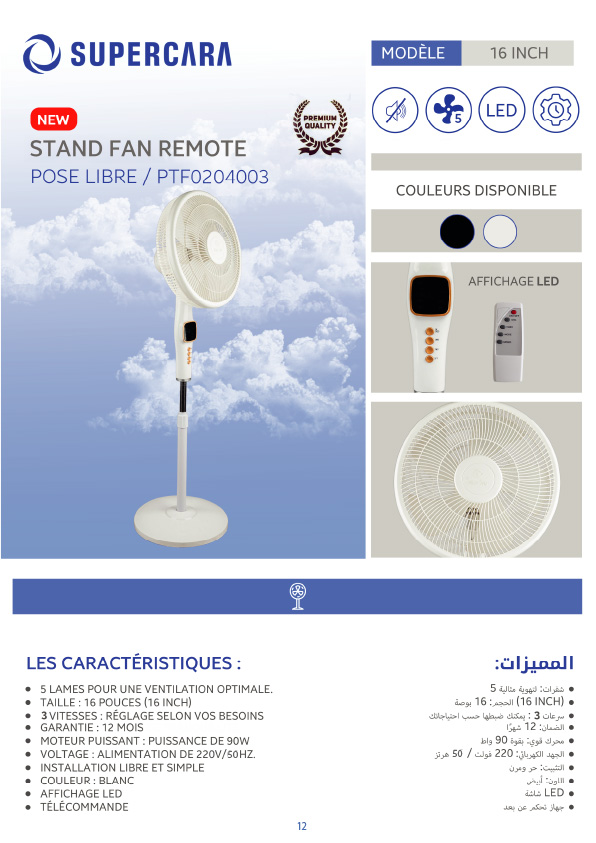 Offrez-vous une ventilation performante et un contrôle pratique avec le SUPERCARA PTF0204003, un ventilateur sur pied doté d’un LED Display et d’une télécommande pour une utilisation simplifiée. Avec ses 5 pales, il assure une diffusion optimale de l’air pour un rafraîchissement efficace.
