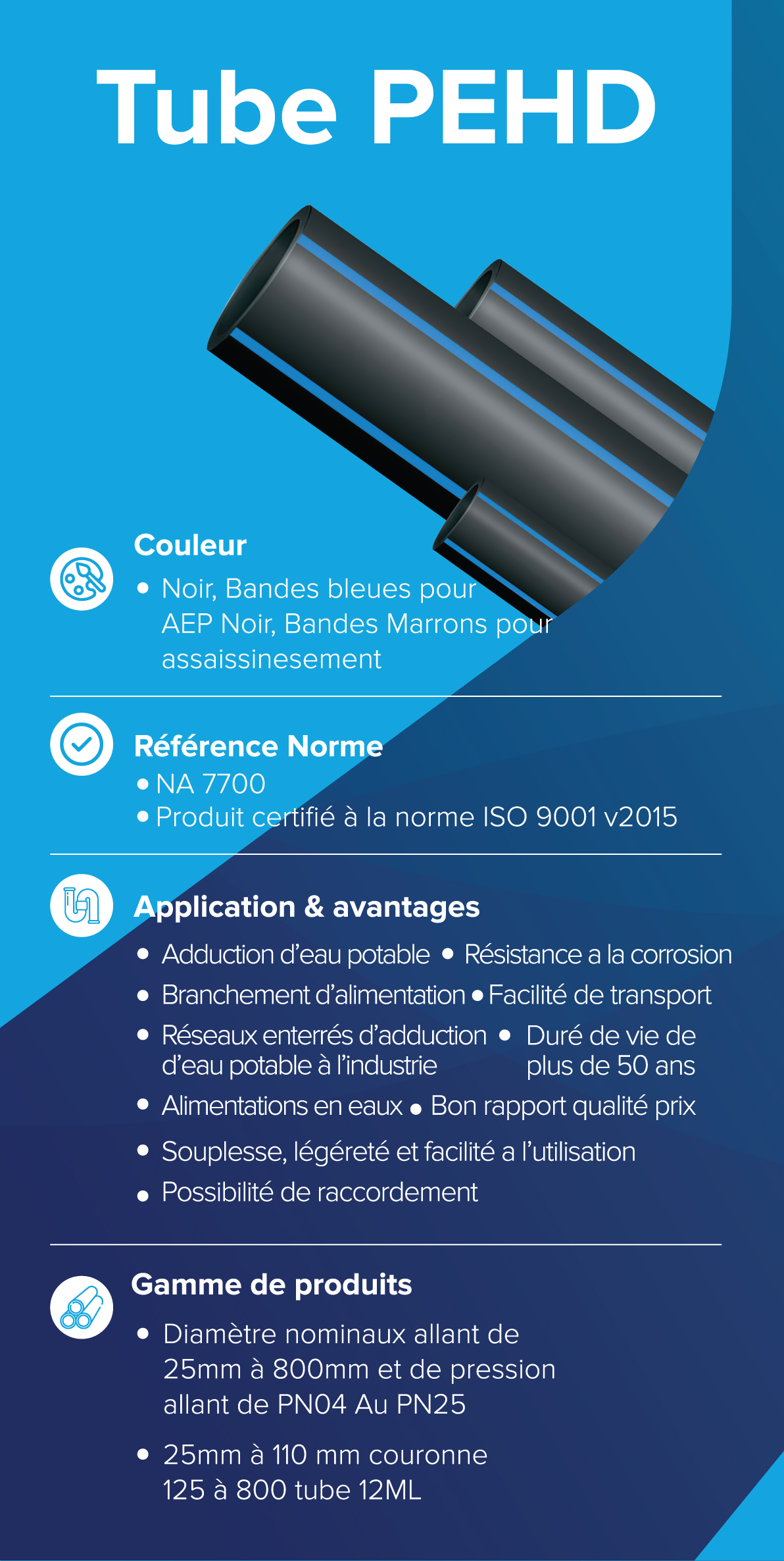 • Couleur : Noir avec bandes bleues pour l’adduction d’eau potable, bandes marron pour l’assainissement.